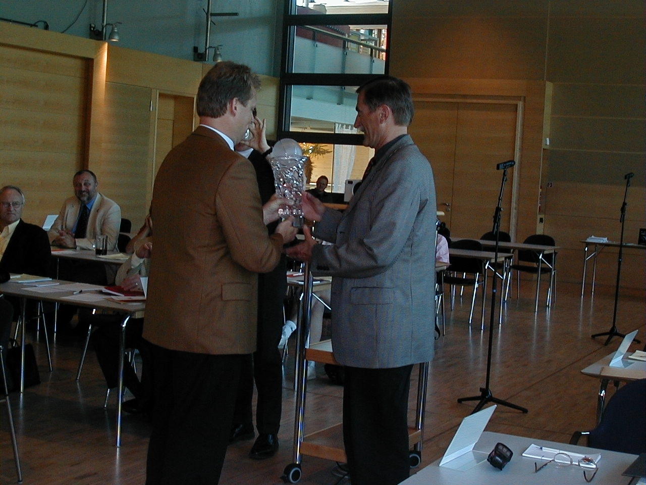Der oberbayerische Bezirksvorsitzende Dr. Rainer König überreicht den Pokal anlässlich des Verbandstags 2001 in Burghausen.