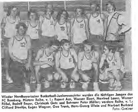 Erstmals seit der Saison 1960/1961 konnten sich die Junioren des 1. FC Bamberg wieder den Titel des Bayerischen Meisters sichern. Dieser Erfolg war um so wichtiger, da nur der Erstplatzierte die Vorrunde der Deutschen Meisterschaft erreichte. Das Eröffnungsspiel gegen den Nordbayerischen Vizemeister TSV Ansbach stellte die Violetten vor keine großen Probleme und wurde mit 86:20 gewonnen. Eine größere Belastungsprobe war die Partie gegen den TSV 1860 München. Nach der Halbzeitführung (45:31) riss plötzlich der Spielfluss der siegessicheren Bamberger und die Löwen kamen bis zur 30. Minuten auf 48:54 heran. Der eingewechselte Eugen Wagner war aber in der verbleibenden Spielzeit unter dem Münchner Korb nicht zu bremsen und sicherte den 75:57 Erfolg. Im entscheidenden dritten Spiel gegen den TSV Nördlingen begann der FC-Nachwuchs so nervös wie lange nicht. Bis zur Halbzeit (26:32) fanden die Violetten überhaupt nicht zu ihrem Spiel. Durch bessere Reboundarbeit der Center Wagner, Schorr und des Amerikaners Stoeltje, sowie gute Offensivaktionen von Aas, drehte der 1. FC innerhalb von sechs Minuten das Ergebnis in eine 52:42 Führung. Wer nun geglaubt hätte, dass die Entscheidung gefallen war, wurde eines Besseren belehrt. Als in der 36. Minute Christoph Gatz mit fünf Fouls ausscheiden musste und die Nördlinger auf Ganzfeldpresse umstellten, war 45 Sekunden vor Spielende beim Stand 74:72 für die Violetten der Spielausgang völlig offen. Nun zeigten aber auch die Nördlinger Nerven und konnten bei einer Serie von sechs Freiwürfen nur einen erfolgreich verwandeln und auf 73:74 verkürzen. Mit einem erfolgreichen Korb von Eugen Wagner hatte das Zittern ein Ende und die Meisterschaft war mit 76:73 zu Gunsten des 1. FC Bamberg entschieden.